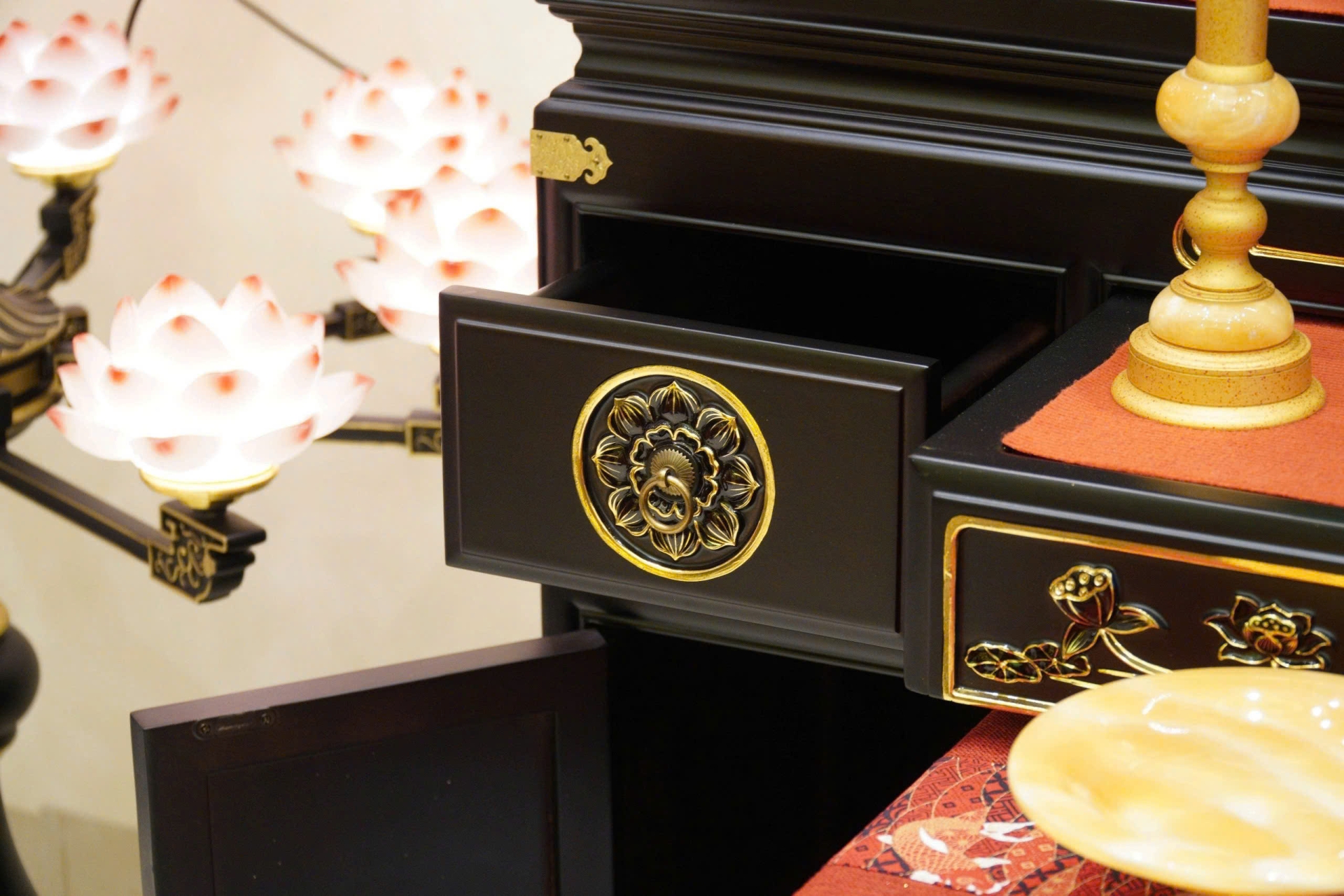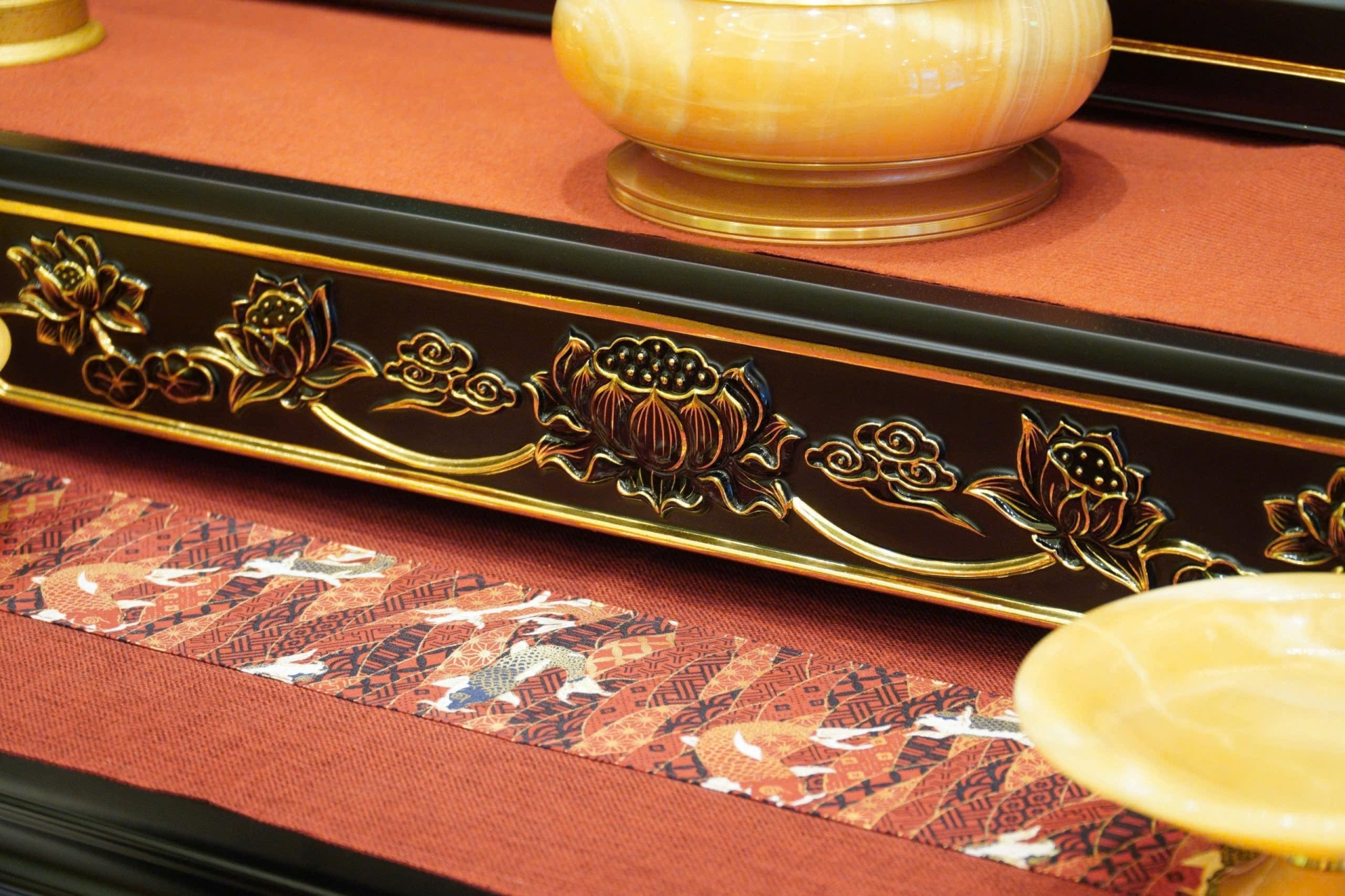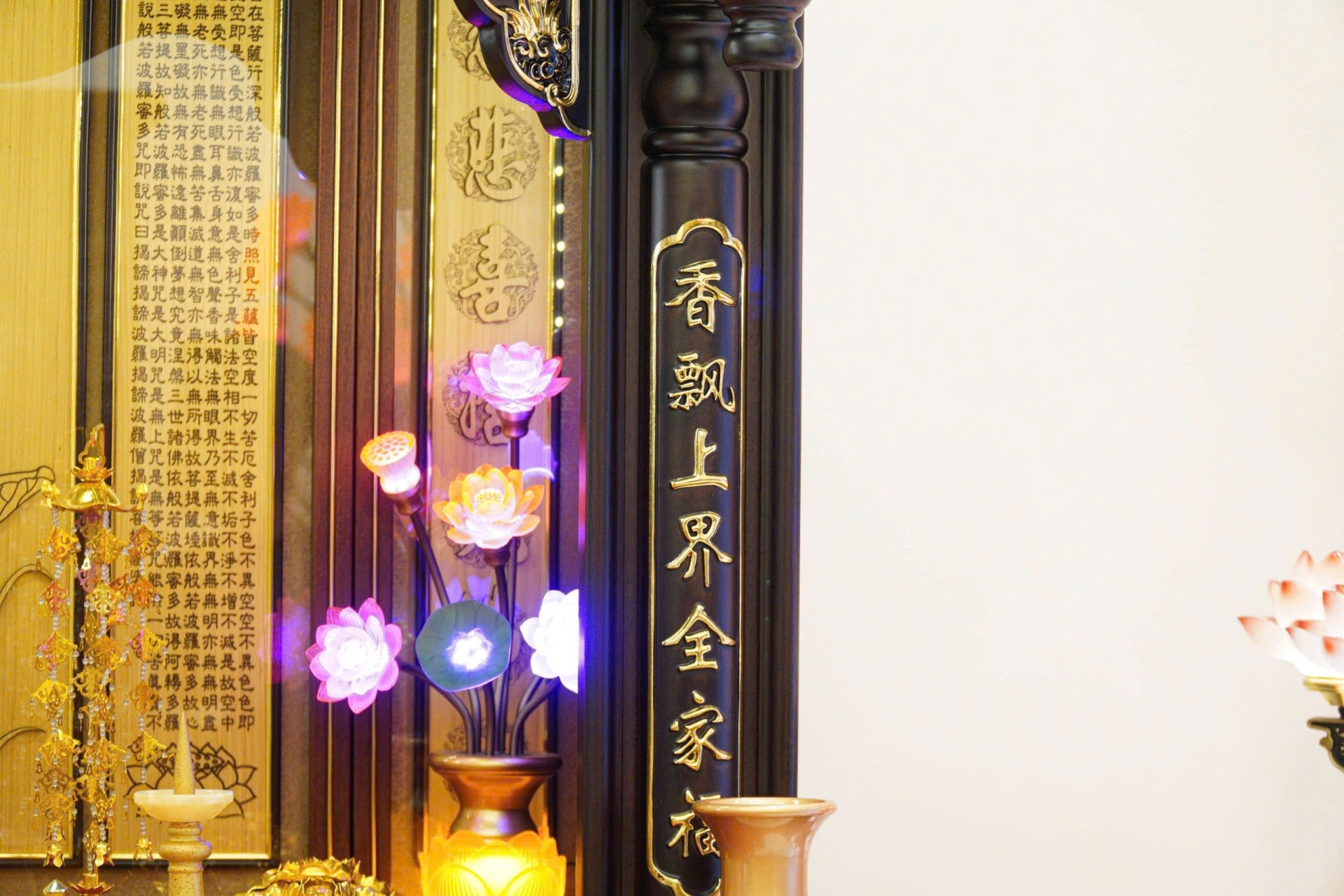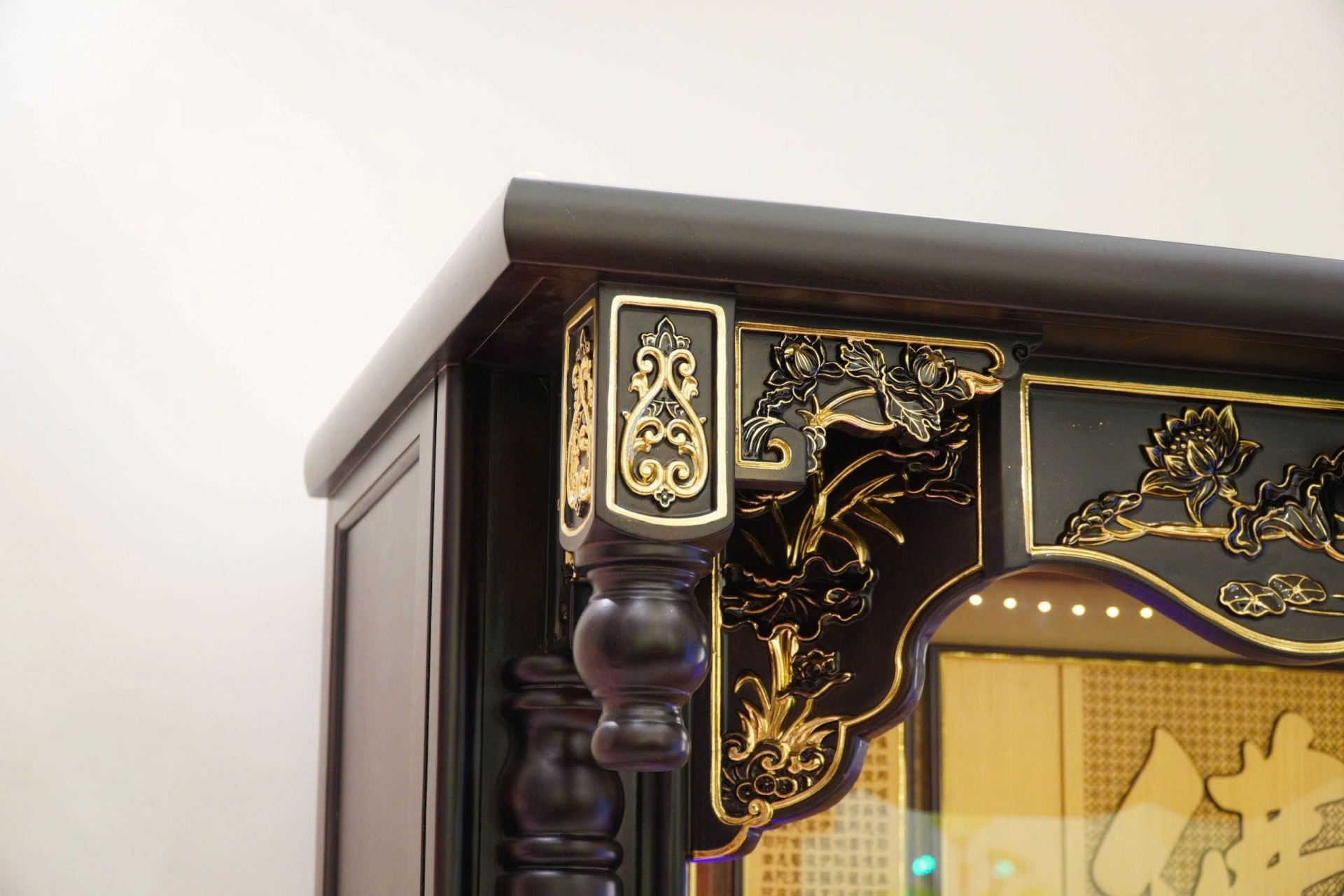 Hoa văn: chạm hoa sen, vẽ vàng khắc kinh Phật