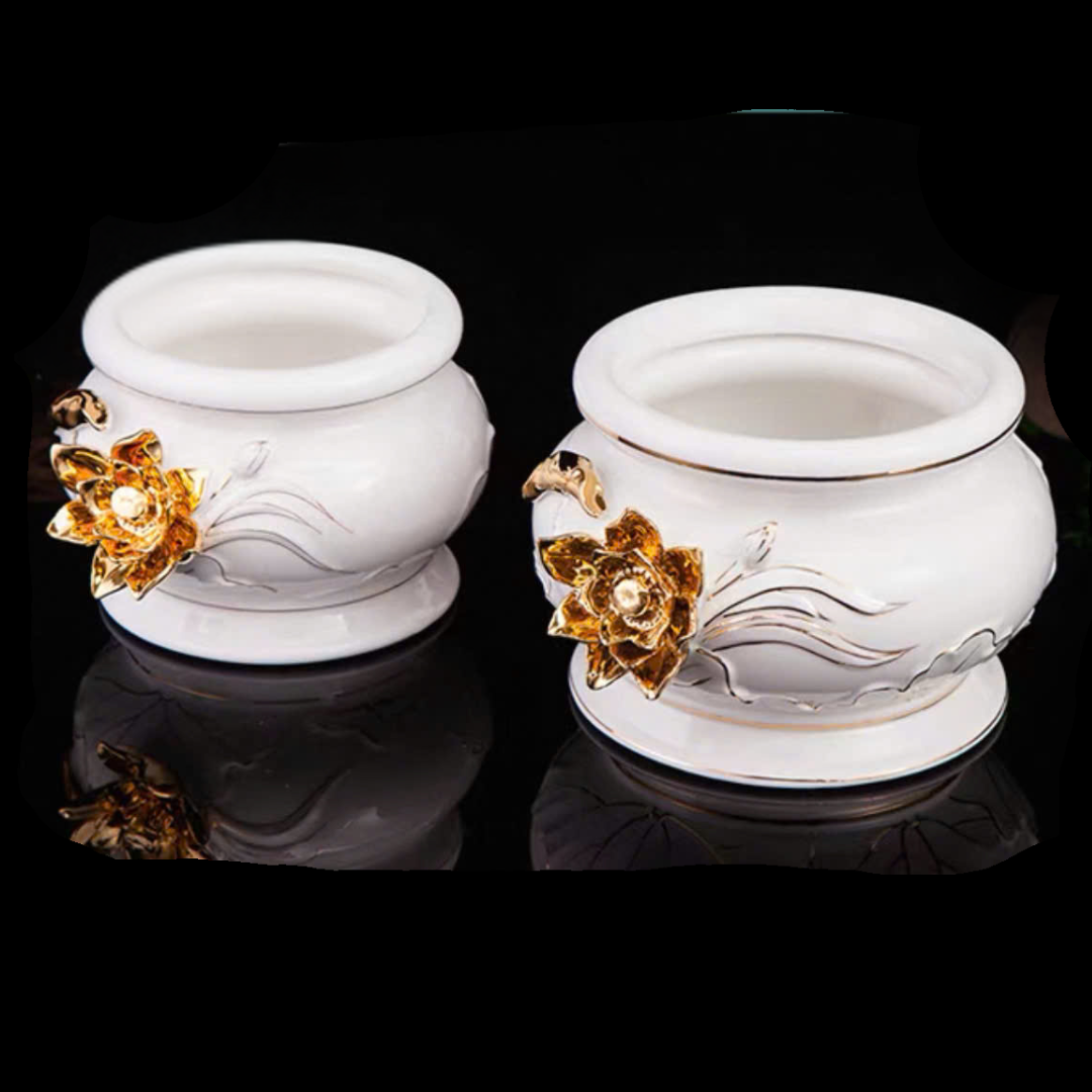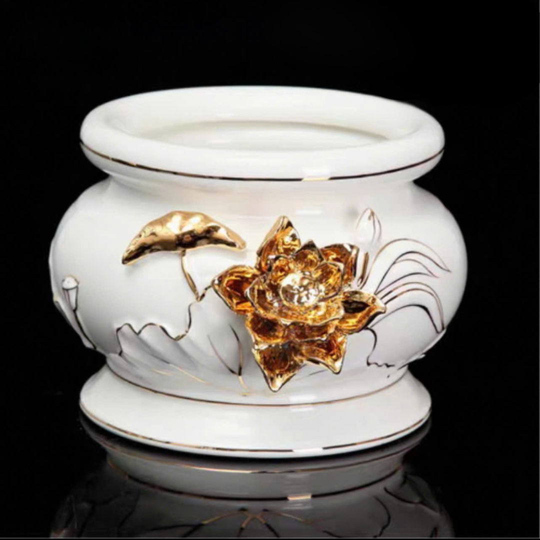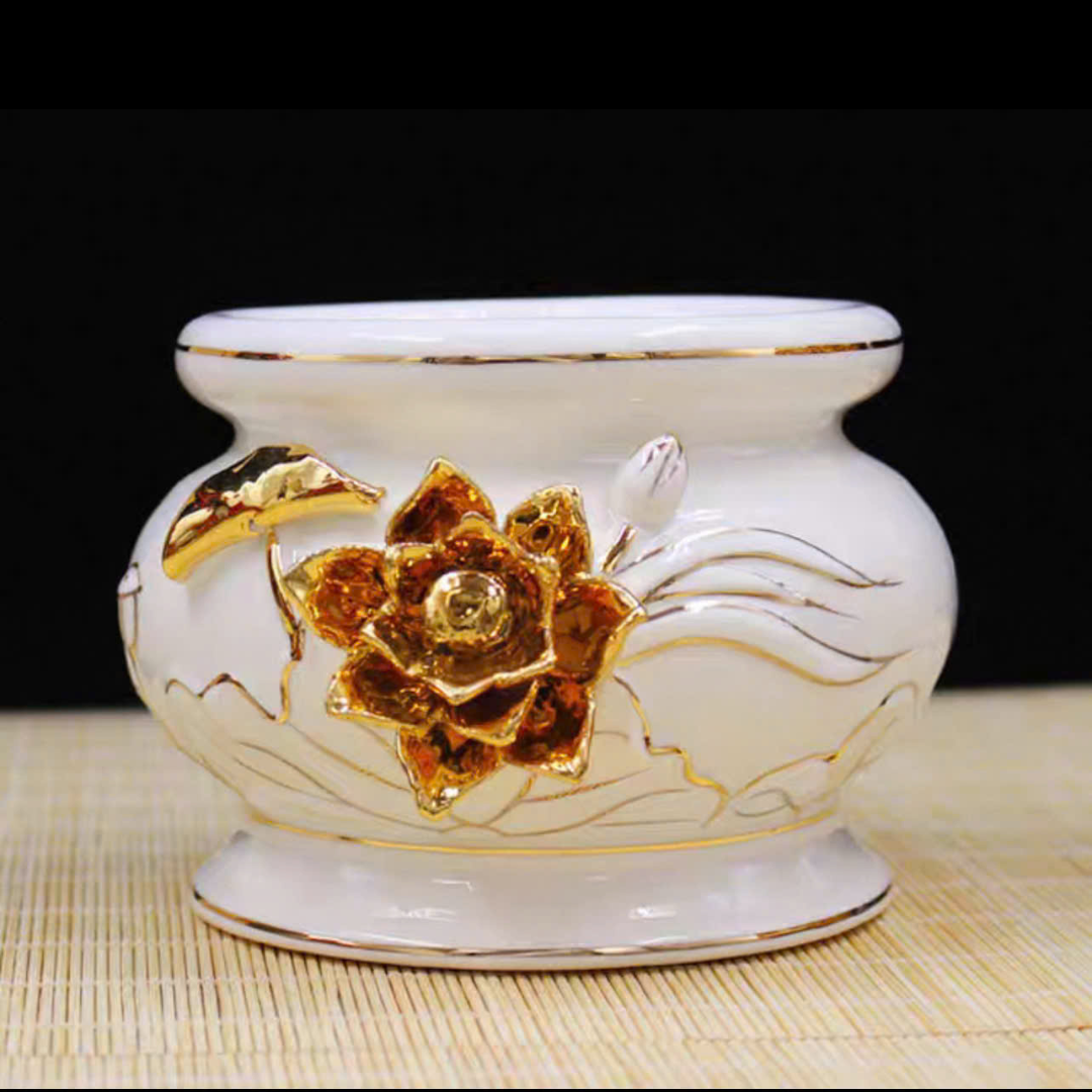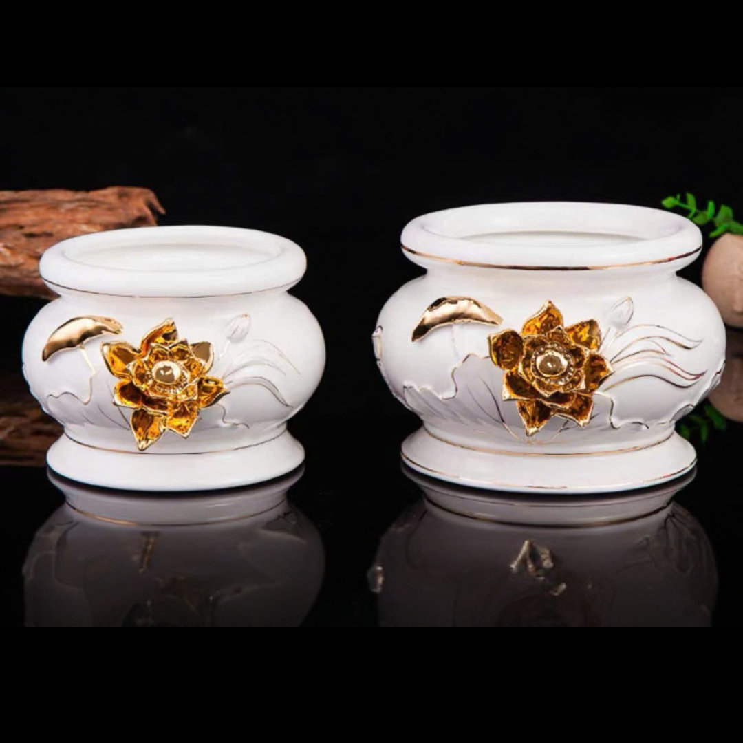 Bát Hương Trắng Kim Nổi được làm từ gốm sứ cao cấp nhập khẩu Đài Loan, có độ bền chắc và tính thẩm mỹ vượt trội. Thiết kế tinh xảo với hoa văn kim nổi sang trọng, gam màu trắng trang nhã giúp bàn thờ thêm phần trang nghiêm, thanh tịnh. Đây là lựa chọn lý tưởng cho không gian thờ cúng gia tiên, vừa mang giá trị phong thủy, vừa thể hiện sự thành kính và tôn nghiêm.