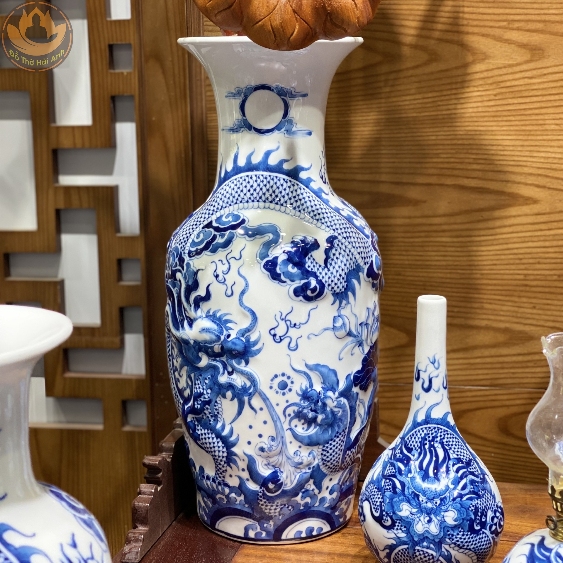 Bộ Đồ Thờ Ngũ Long Nổi Men Lam là tuyệt phẩm gốm sứ Bát Tràng mang vẻ đẹp cổ kính kết hợp với họa tiết Rồng đắp nổi men lam, biểu trưng cho ngũ hành tương sinh, vượng khí vững bền và bảo hộ gia đạo.