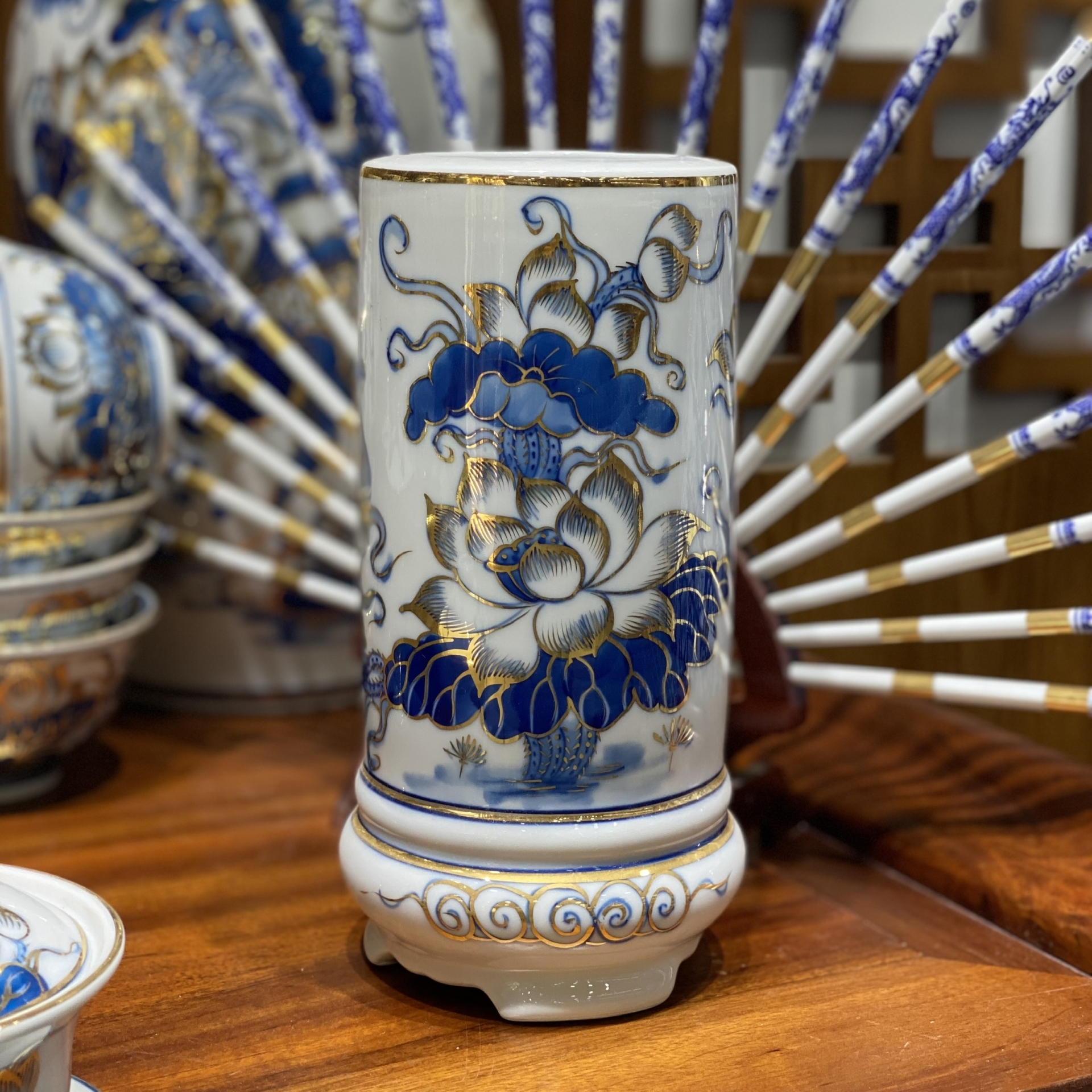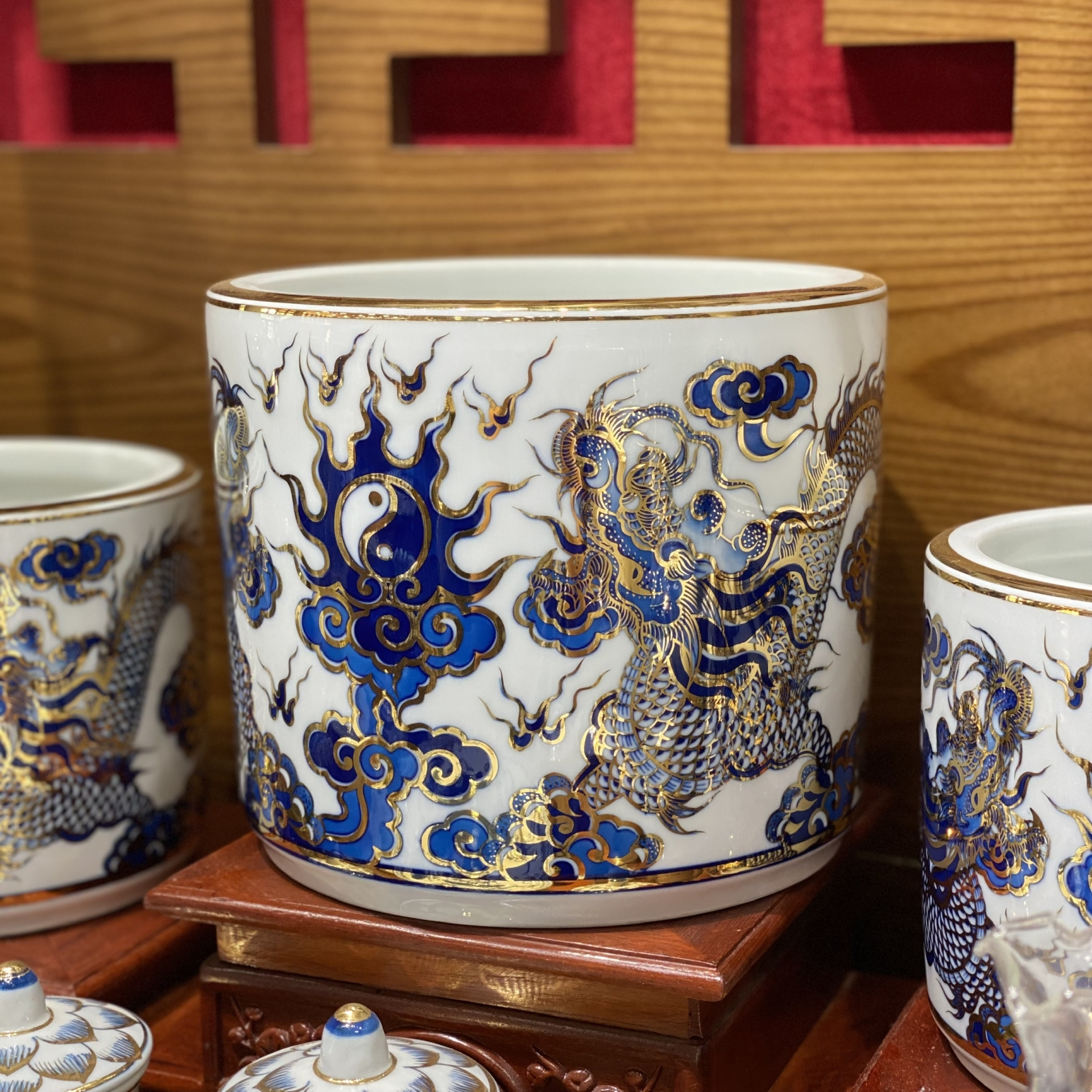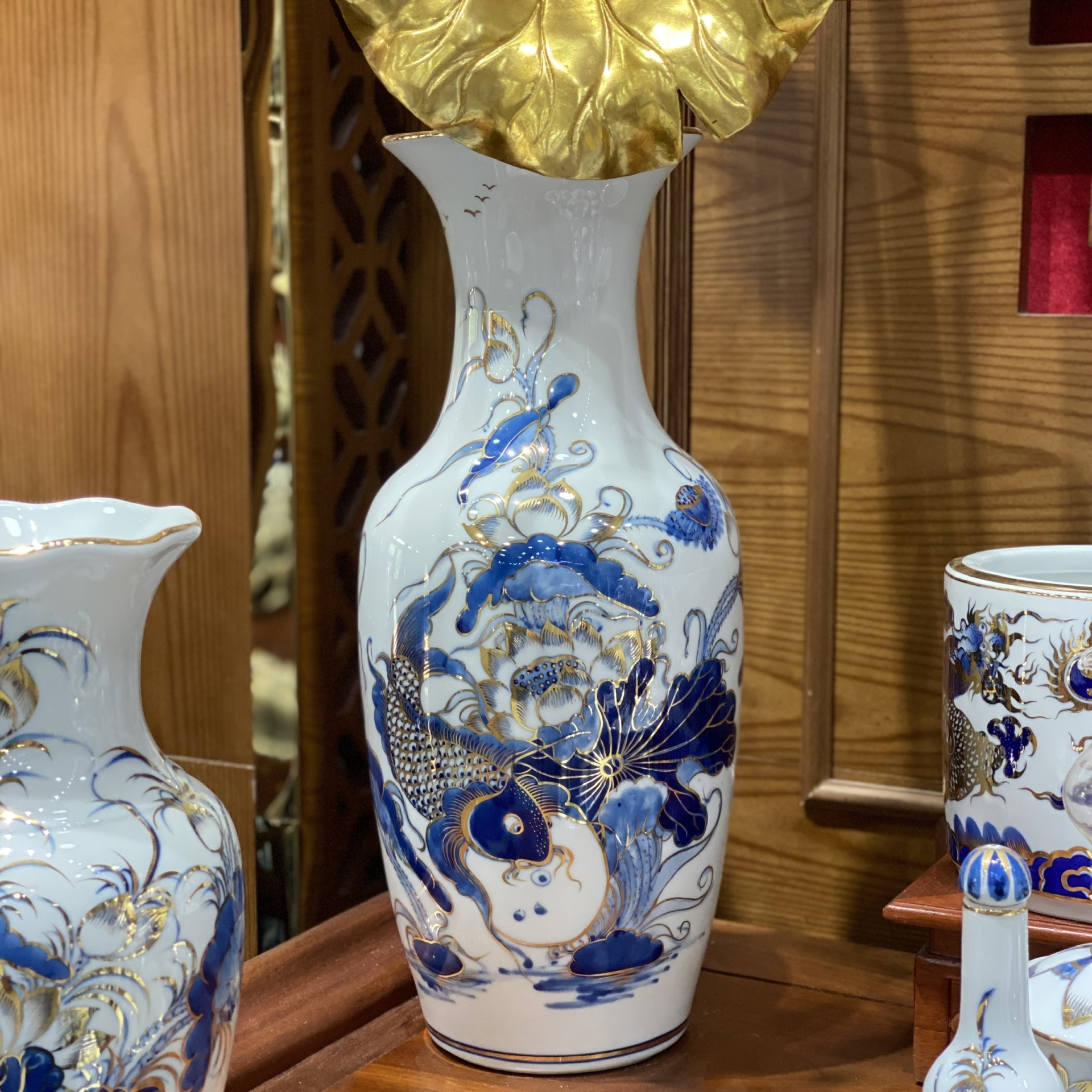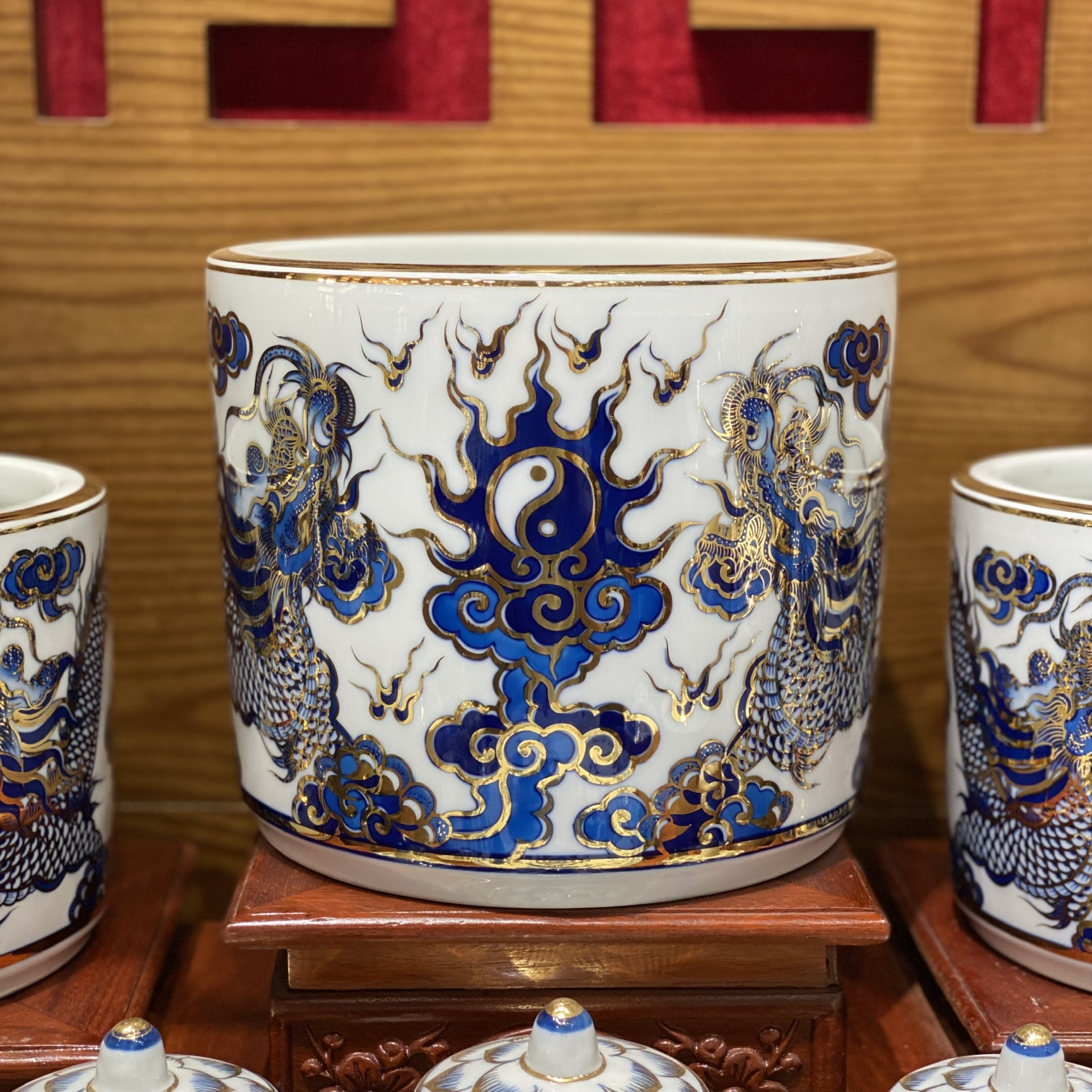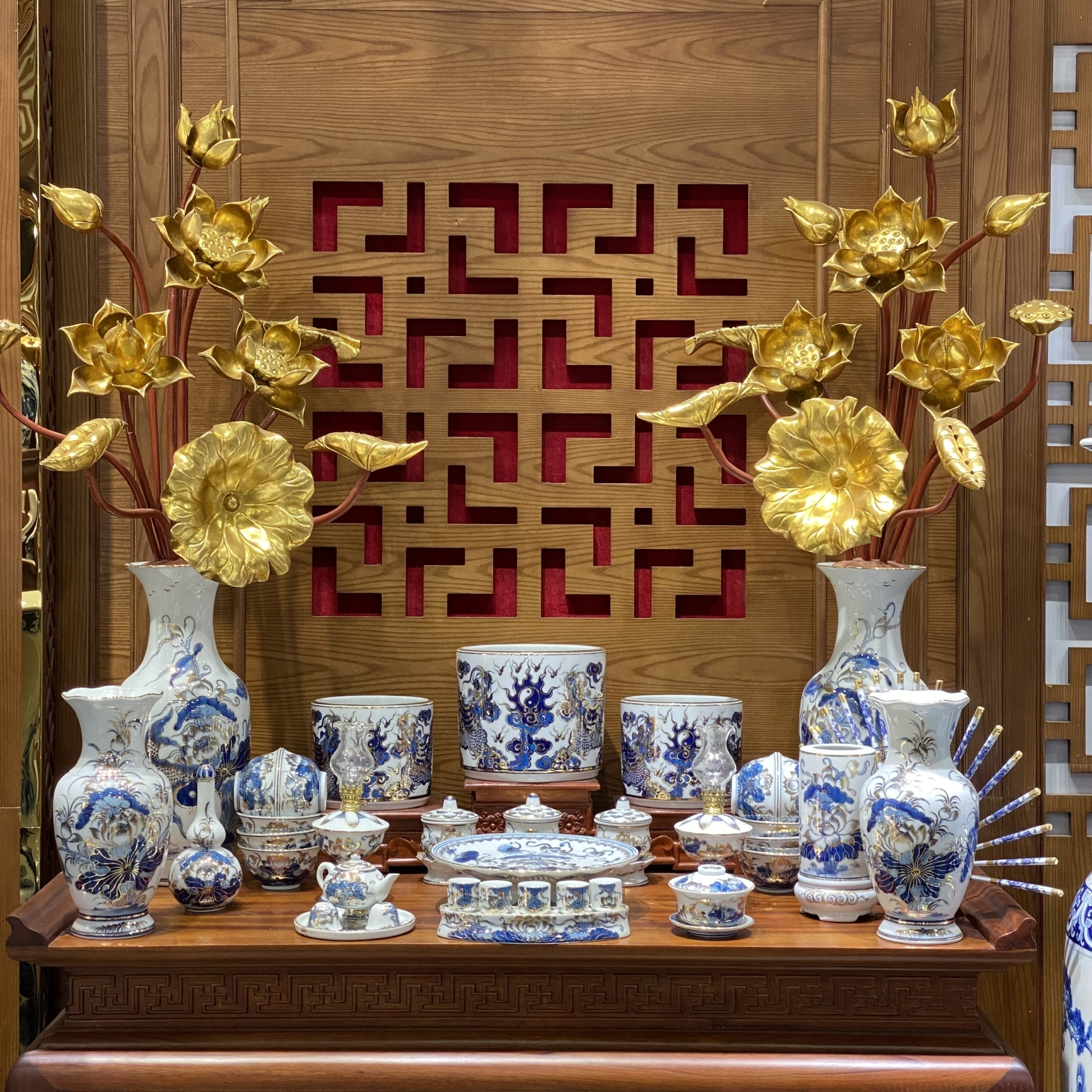 Bộ Đồ Thờ Phú Quý Vàng Kim Men Lam – Vẻ Đẹp Trang Nghiêm, Tụ Lộc Hưng Gia