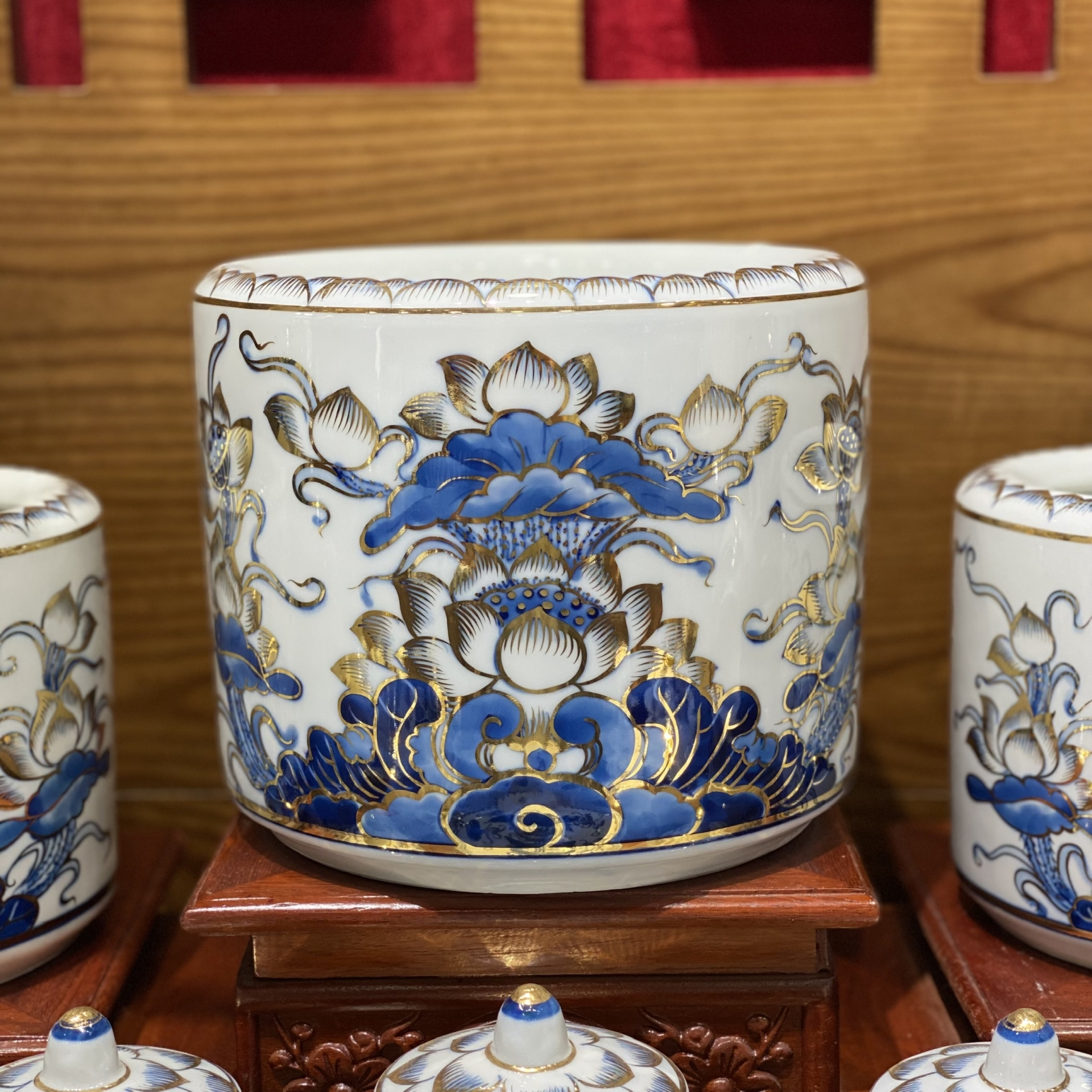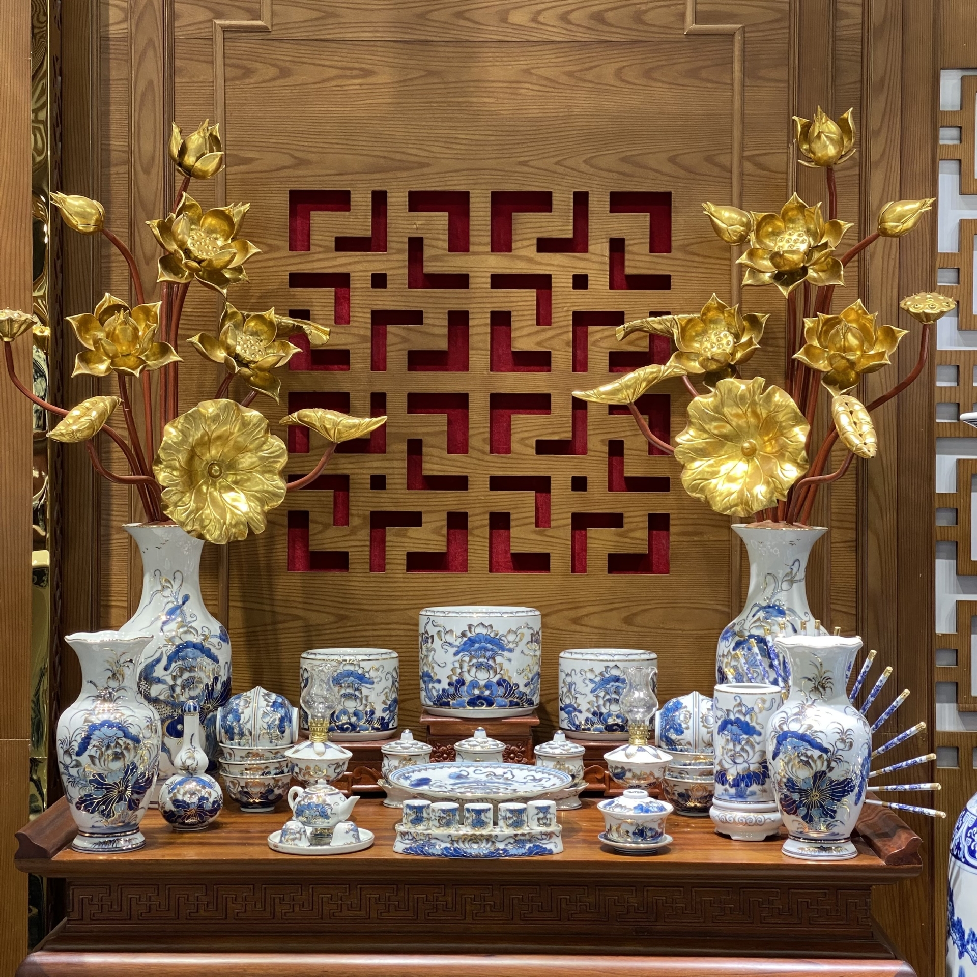 Bộ Đồ Thờ Lộc Phát Sen – Men Lam Vàng Kim | Tụ Lộc - Sinh Phúc - Thịnh Vượng Trường Tồn