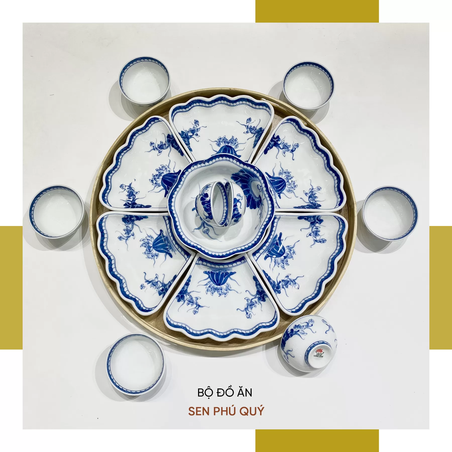 Bộ đồ ăn hoa sen phú quý men lam – dòng sản phẩm cao cấp được chế tác trên chất liệu sứ trắng cao cấp, men lam truyền thống. Sản phẩm được lấy ý tưởng từ hình họa “hoa mặt trời”. Mang vẻ đẹp hiện đại, sang trọng pha lẫn vẻ cổ điển từ đồ án hoa văn xưa.