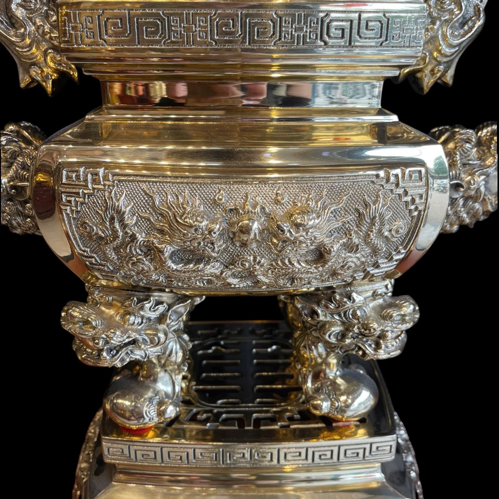 Đỉnh vuông đồng vàng mặt trước được chạm trổ song long chầu mặt nguyệt với đường nét tinh xảo, sắc nét, với thiết kế hai bên tai mây và đầu lân ôm quả cầu lửa. càng làm tăng thêm vẻ uy nghi vốn có