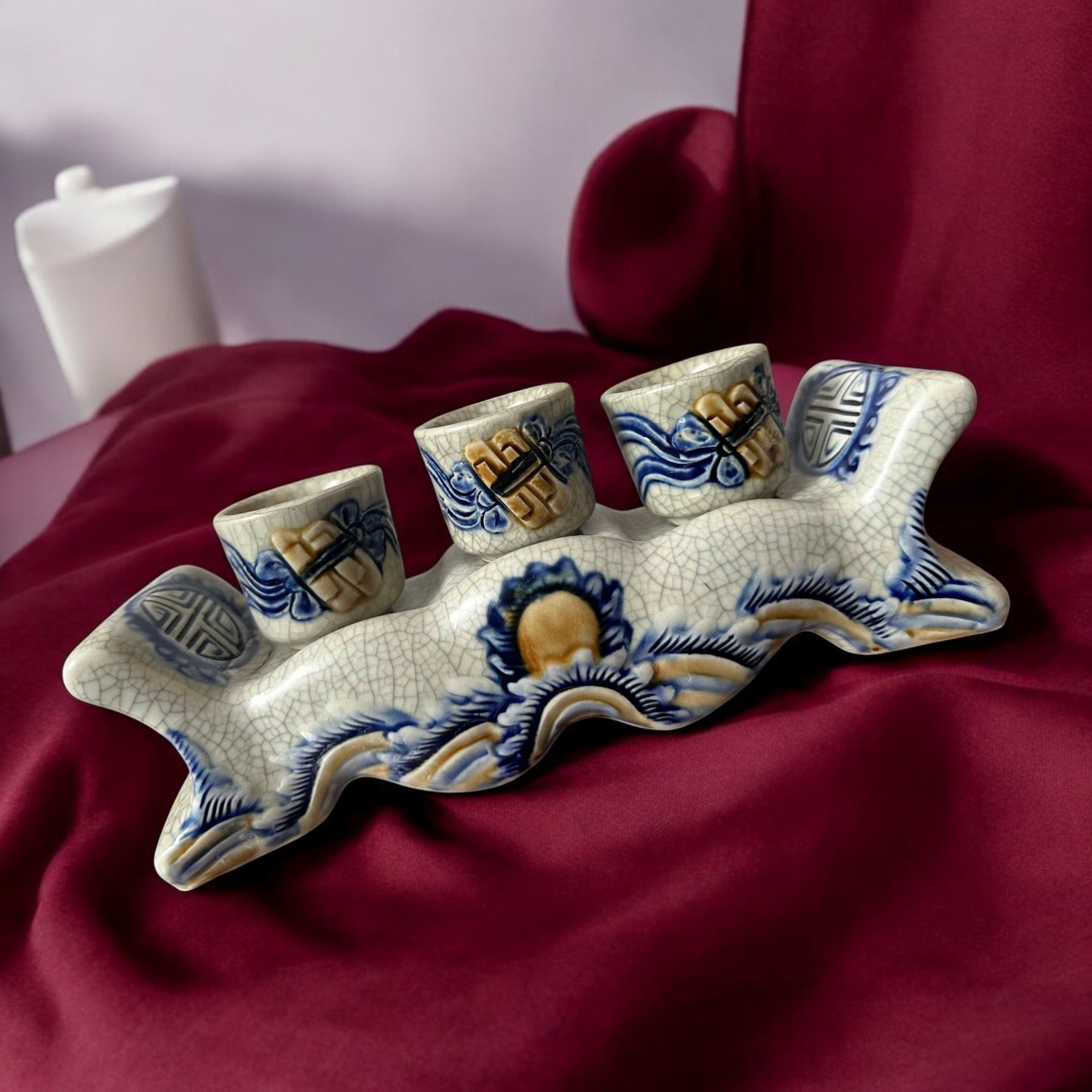 Kỷ ngai 3 chén men rạn được làm từ gốm sứ cao cấp, chế tác bằng kỹ thuật truyền thống. Kỹ thuật này tạo ra những vết nứt nhỏ trên bề mặt men, tạo nên hiệu ứng màu sắc độc đáo và sự sang trọng cho sản phẩm. Các vết rạn không chỉ có giá trị thẩm mỹ mà còn chứng tỏ quá trình nung nhiệt tinh xảo