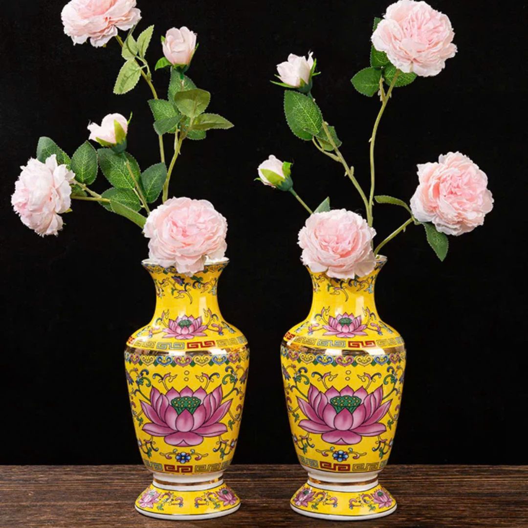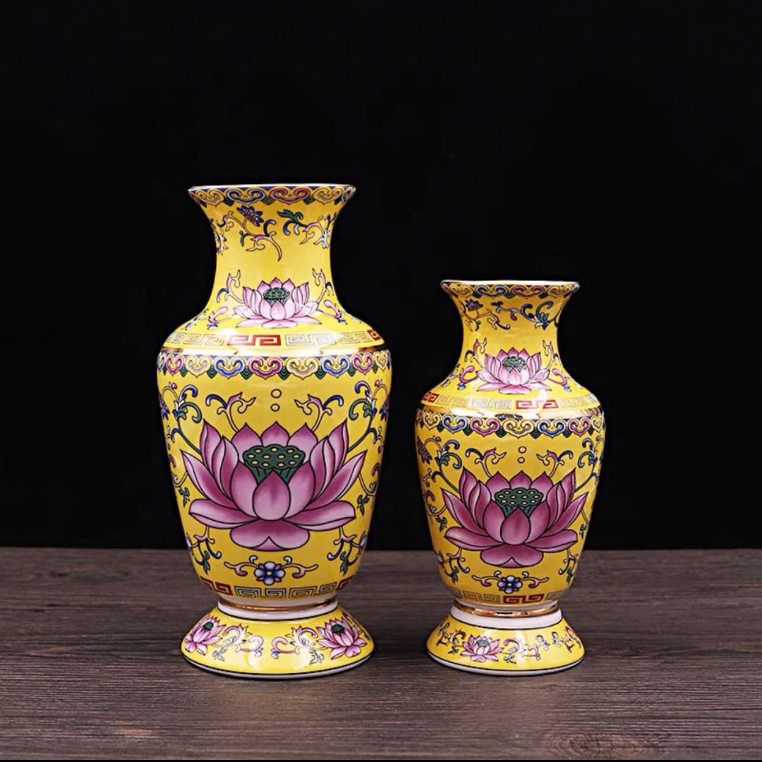 Lọ Hoa Gấm Vàng Hoa Sen Cao Cấp được chế tác tinh xảo với chất liệu gấm vàng sang trọng, điểm xuyết họa tiết hoa sen thanh khiết. Sản phẩm mang ý nghĩa linh thiêng, phù hợp đặt trên bàn thờ gia tiên, bàn thờ Phật để cắm hoa sen, hoa tươi hoặc hoa giả. Lọ hoa gấm vàng không chỉ tăng thêm vẻ trang nghiêm, tôn kính mà còn giúp không gian thờ cúng hài hòa phong thủy.